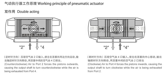 德國萊克雙作用氣動球閥球體是由旋塞閥轉變而來的,它的球心為旋轉90°的動作,球體繞閥體中心線作旋轉來達到開啟,有圓形通孔或通道通過其軸線。當球心旋轉到90°時閥門處于緊閉狀態,當執行器工作時,只需很小的轉動力矩就能將閥門關緊嚴密,從而可達到快速截斷切斷的原理。