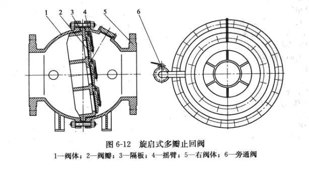 03多瓣式對(duì)于大口徑止回閥,如果采用單瓣式結(jié)構(gòu),當(dāng)介質(zhì)反向流動(dòng)時(shí),必然會(huì)產(chǎn)生相當(dāng)大的水力沖擊,甚至造成閥瓣和閥座密封面的損壞,因而采用多瓣式(圖6-12)結(jié)構(gòu)。它的啟閉件是由許多個(gè)小直徑的閥瓣組成的,當(dāng)介質(zhì)停止流動(dòng)或倒流時(shí),這些小閥瓣不會(huì)同時(shí)關(guān)閉,大大減弱了水力沖擊。由于小直徑的閥瓣本身重量輕,關(guān)閉動(dòng)作也比較平穩(wěn),閥瓣對(duì)閥座的撞擊力較小,不會(huì)造成密封面的損壞。多瓣式適用于公稱尺寸DN600以上的止回閥。較大口徑的旋啟式止回閥可帶有旁通閥。
