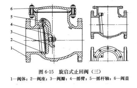 01單瓣式(圖6-11)只有一個(gè)閥座通道和一個(gè)閥瓣,適用于中等口徑旋啟式止回閥。